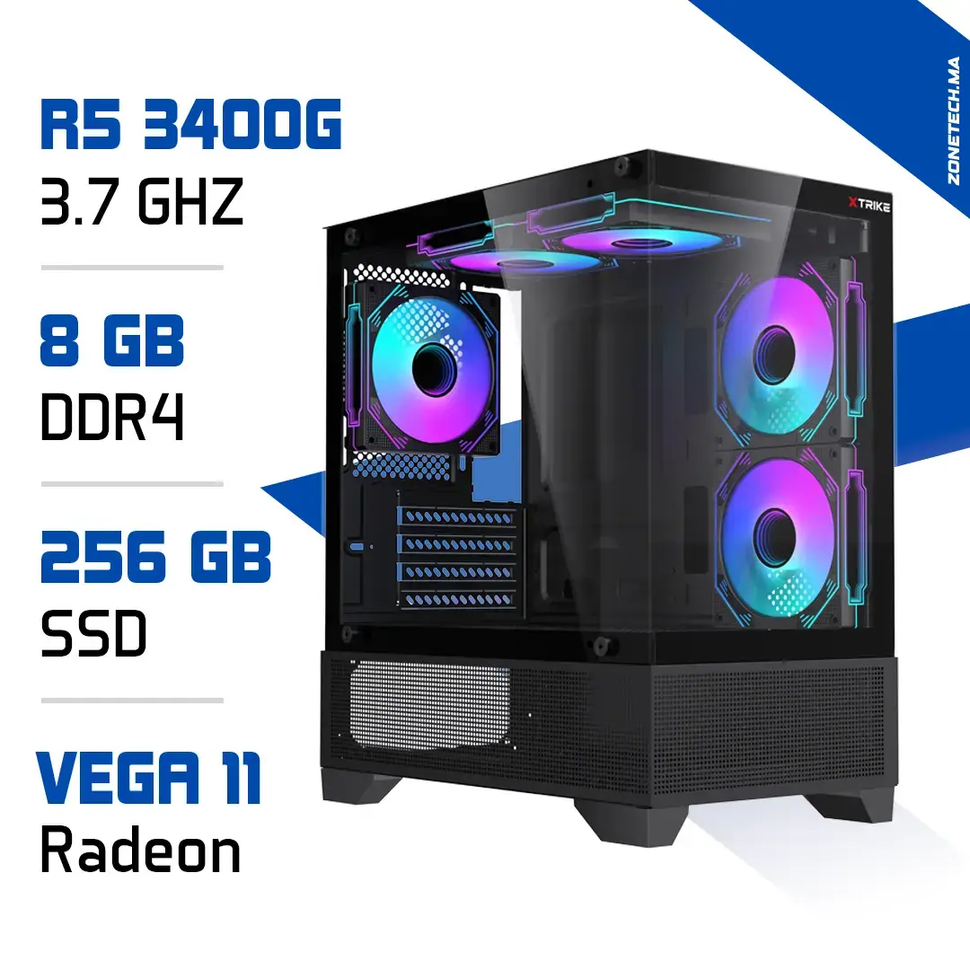 Ce PC Gamer Ryzen 5 3400G avec Vega 11 est disponible exclusivement sur Zonetech.ma, votre spécialiste du gaming au Maroc :