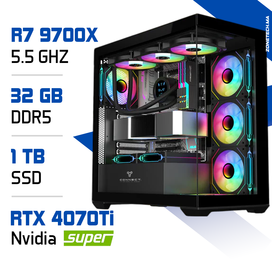 Ce PC Gamer R7 9700X / RTX 4070Ti SUPER est disponible exclusivement sur Zonetech.ma, la référence au Maroc pour le matériel gaming.