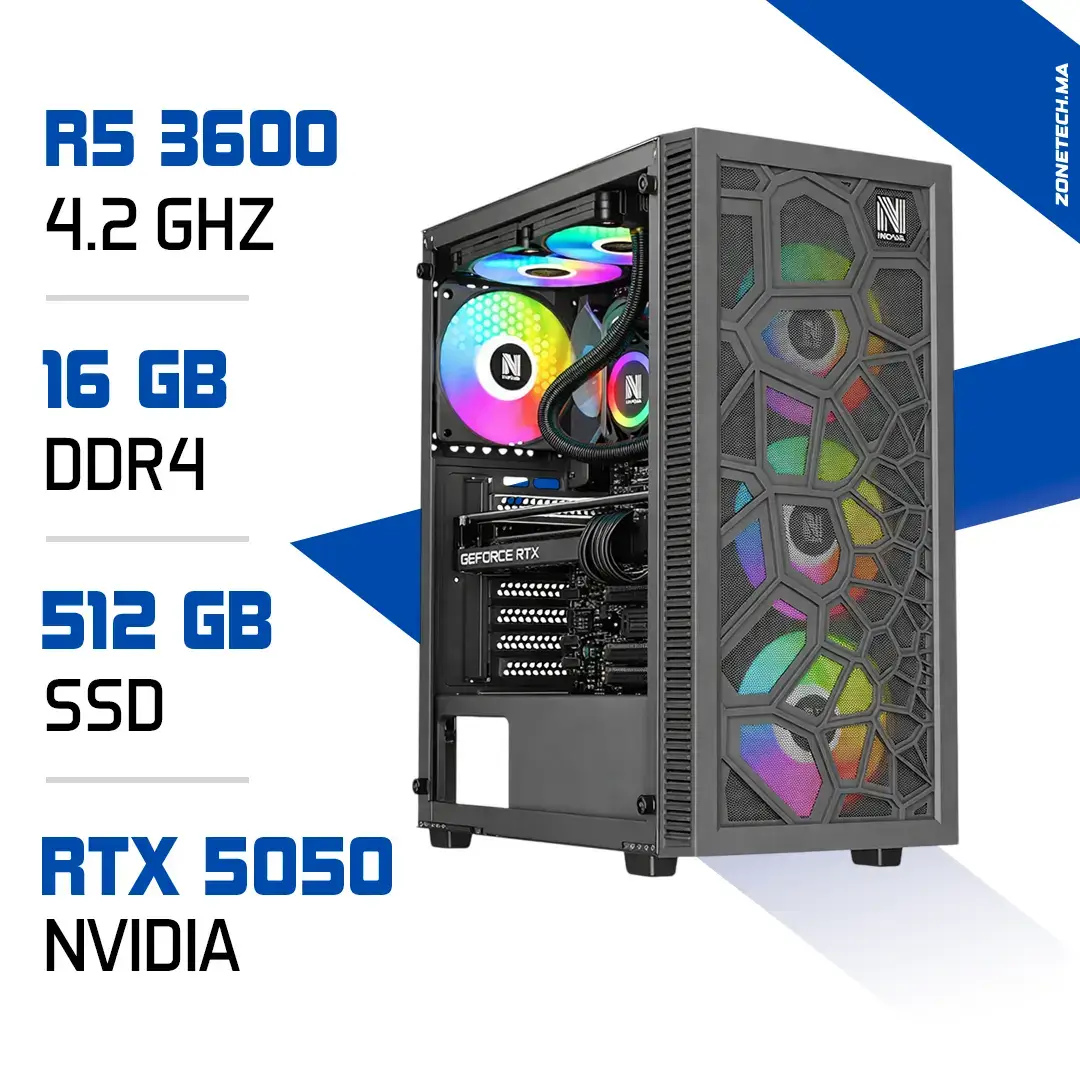 PC Gamer Zonetech Ryzen 5 3600 / 512GB SSD / 16GB / RTX 5050 8G – Performance et fluidité au meilleur prix au Maroc