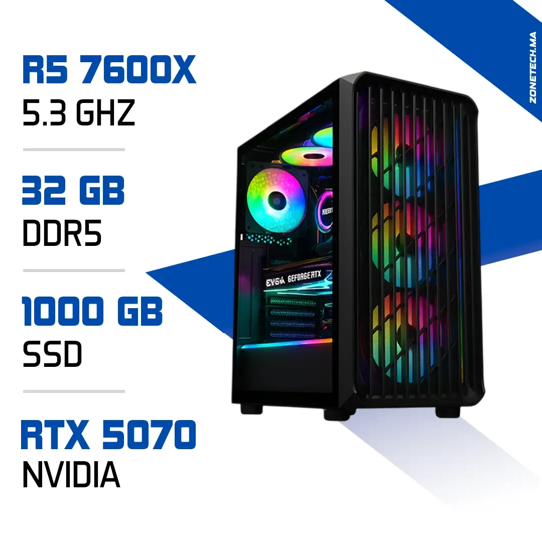 PC Gamer Zonetech Ryzen 5 7600X / 32GB RAM / 1000 GB SSD / RTX 5070 12GB – Gaming Haute Performance au Maroc