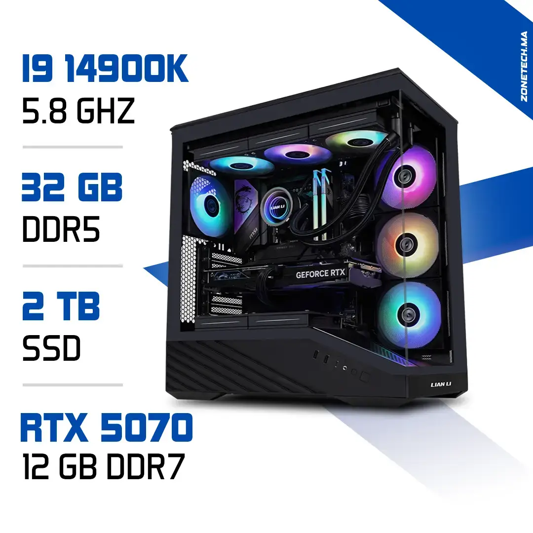Commandez votre PC Pro i9-14900K / RTX 5070 sur Zonetech.ma. Bénéficiez d’une station puissante, prête pour les logiciels professionnels et les jeux 4K. Livraison rapide partout au Maroc !