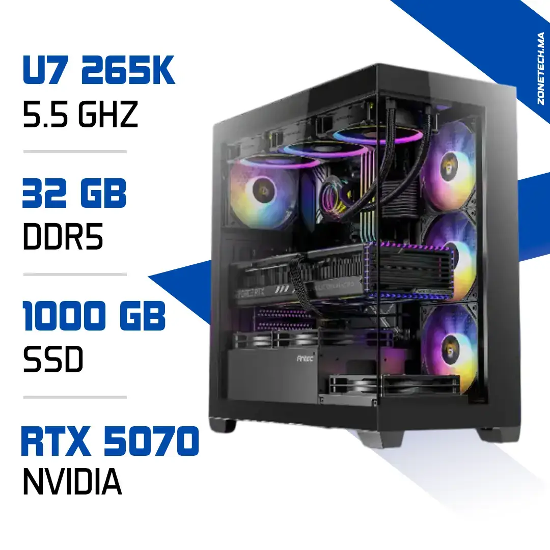 Commandez votre PC Pro Ultra 7 265K / RTX 5070 sur Zonetech.ma. Bénéficiez d’une station puissante, prête pour les logiciels professionnels et les jeux 4K. Livraison rapide partout au Maroc !