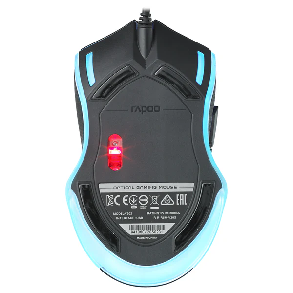 Le design du Rapoo V20S moderne avec des lignes épurées et des éclairages LED. Ces les éléments améliorent qui non seulement l’apparence visuelle de la souris, mais aussi l’ambiance du jeu. Les LED peuvent être ajustées selon les préférences, offrant une touche de personnalisation.
