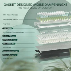 Son design avec joint et structure innovante réduit le bruit et améliore la réactivité. Les touches linéaires Mint Mambo personnalisées offrent une course fluide, douce et silencieuse. De plus, les multiples couches de mousse et coussinets acoustiques réduisent considérablement les bruits parasites, pour une frappe nette et confortable.