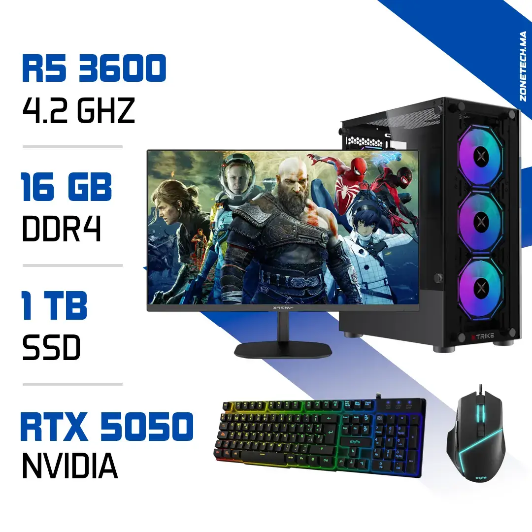 Commandez dès maintenant le Setup Complet PC Gamer Zonetech Ryzen 5 3600 / RTX 5050 sur Zonetech.ma et profitez d’un pack complet au meilleur prix au Maroc. Livraison rapide dans tout le royaume : Casablanca, Marrakech, Rabat, Fès et Tanger.