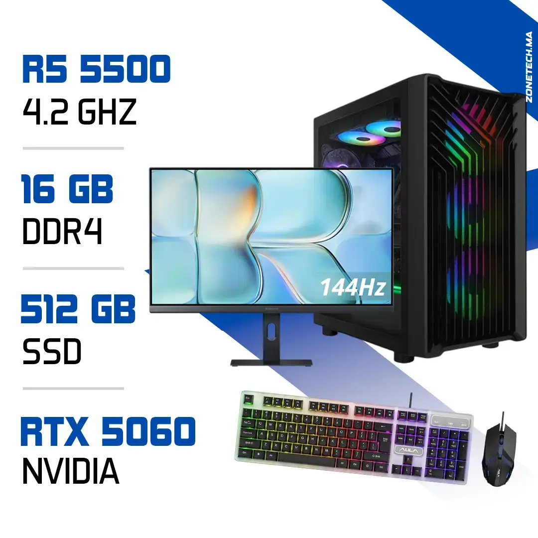 Commandez dès maintenant le Setup Complet PC Gamer Zonetech Ryzen 5 5500 / RTX 5060 sur Zonetech.ma et profitez d’un pack complet au meilleur prix au Maroc. Livraison rapide dans tout le royaume : Casablanca, Marrakech, Rabat, Fès et Tanger.
