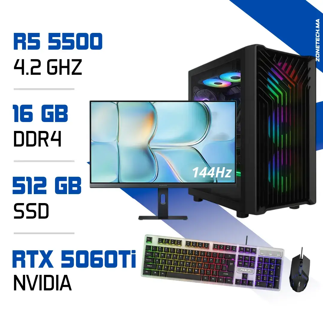 Setup Complet PC Gamer Zonetech Ryzen 5 5500 / 512 GB SSD / 16GB / RTX 5060Ti + AULA F3061 Combo 2in1 + Xiaomi A24i 23,8″ 144HZ FHD