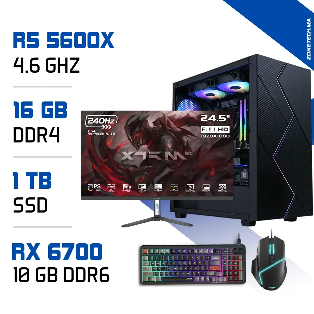 Setup Complet PC Gamer Zonetech Ryzen 5 5600X / 16GB / 1TB SSD / RX 6700 – Écran 240Hz inclus
