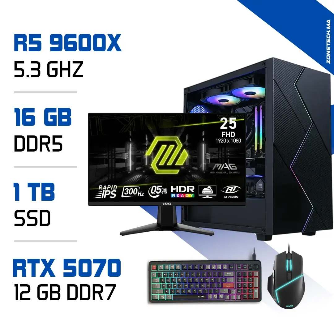 Setup Complet PC Gamer Zonetech Ryzen 5 9600X / 16GB / 1TB SSD / RTX 5070 – Écran 200Hz inclus